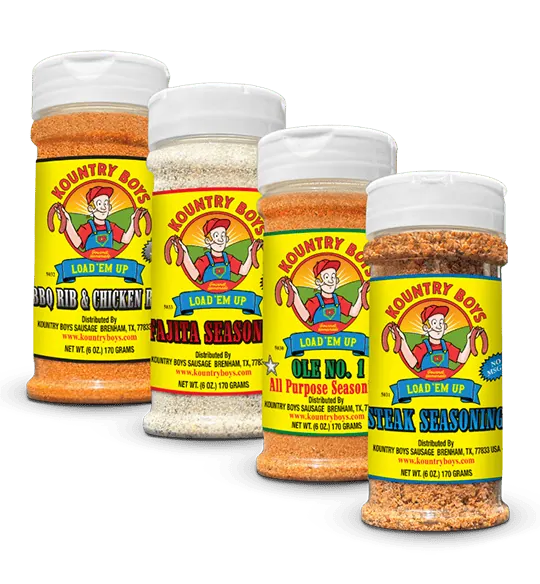 Bring home the taste of Texas with Kountry Boys Seasonings. From all-purpose favorites to blends crafted for fajitas, steak, ribs and chicken, each mix is made with premium ingredients to keep mealtime flavorful. Kountry Boys seasonings make every bite taste like home, so go ahead and load ’em up.